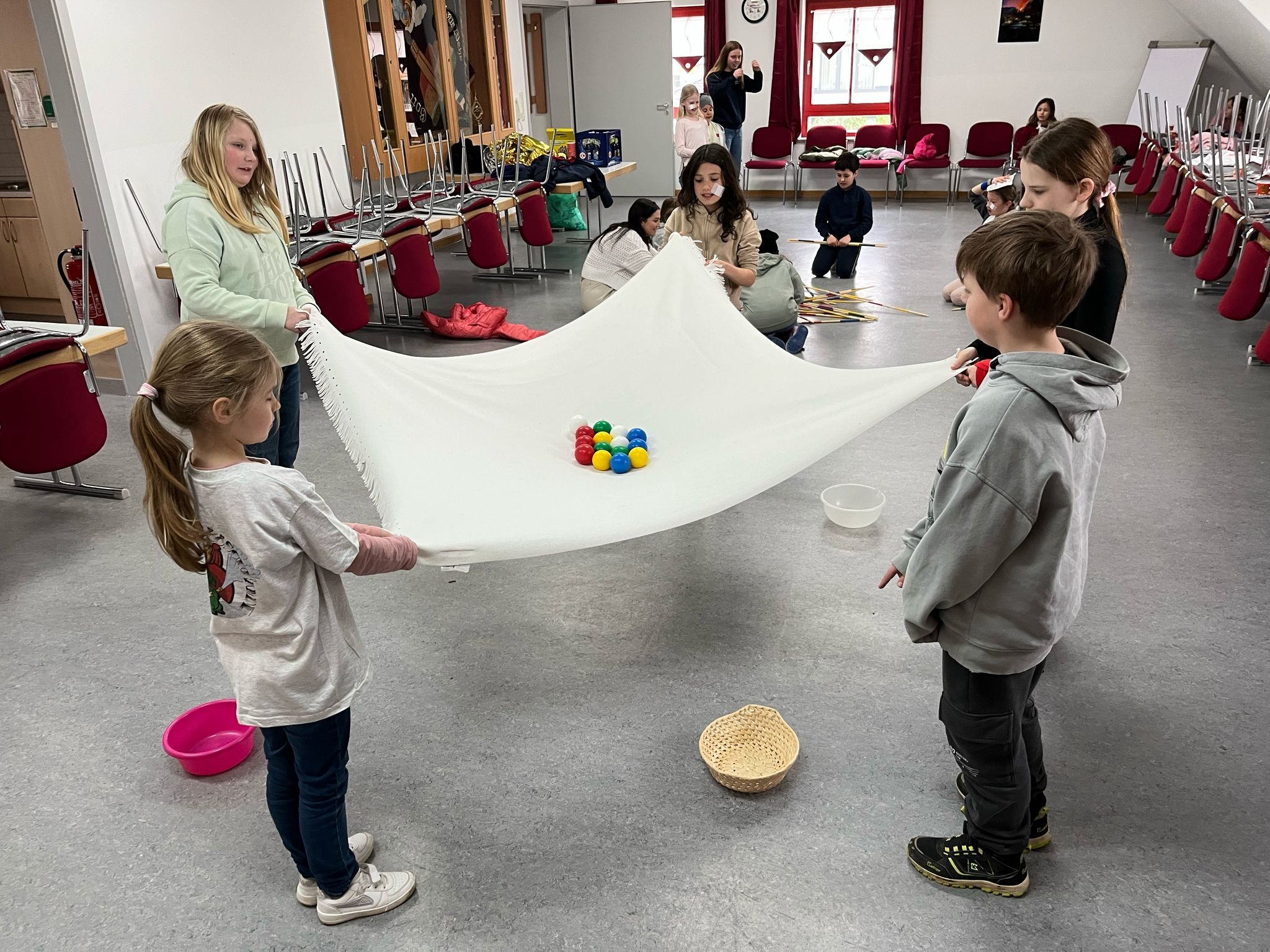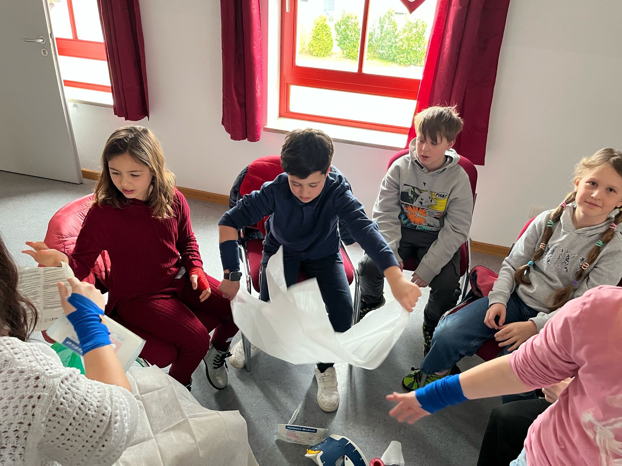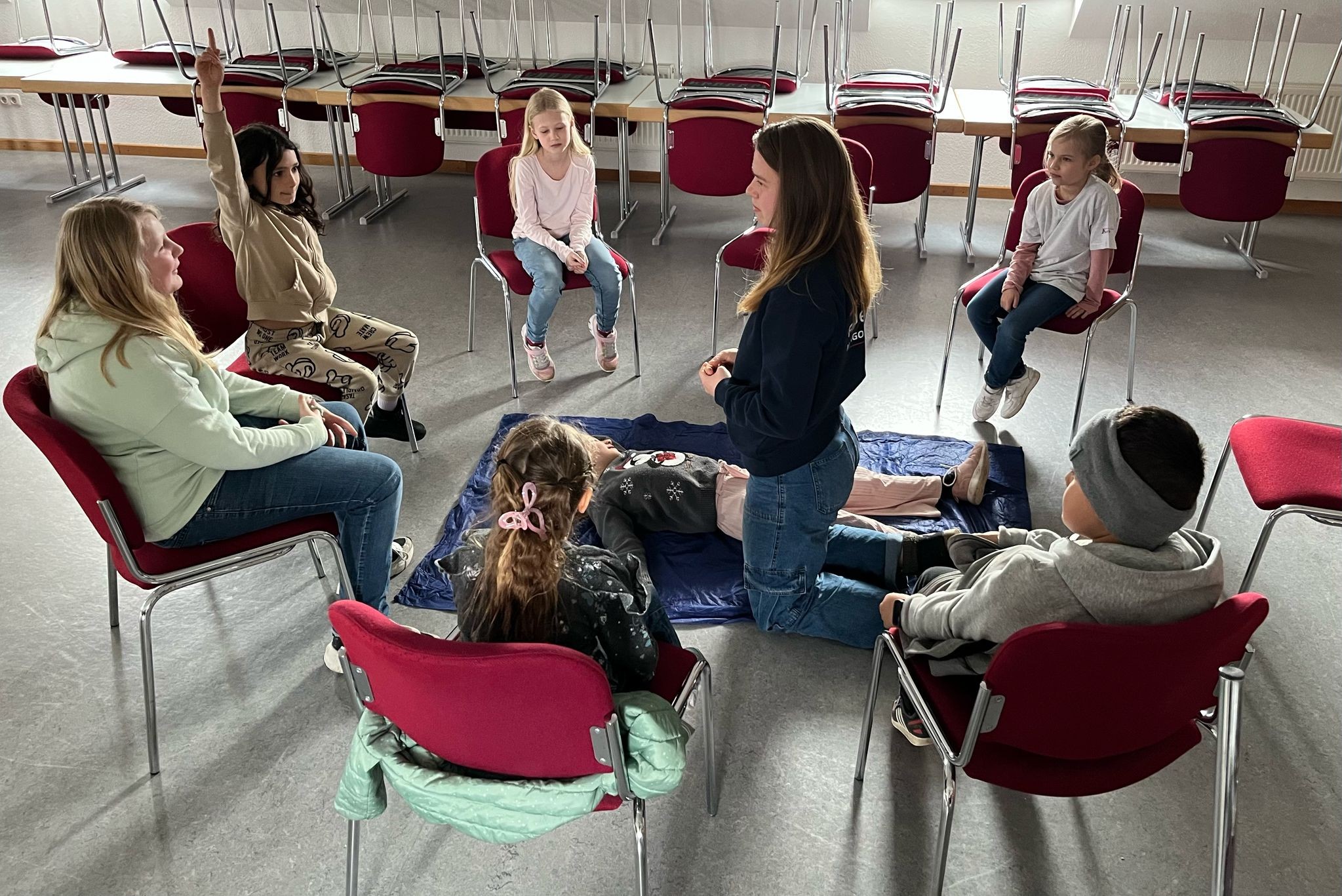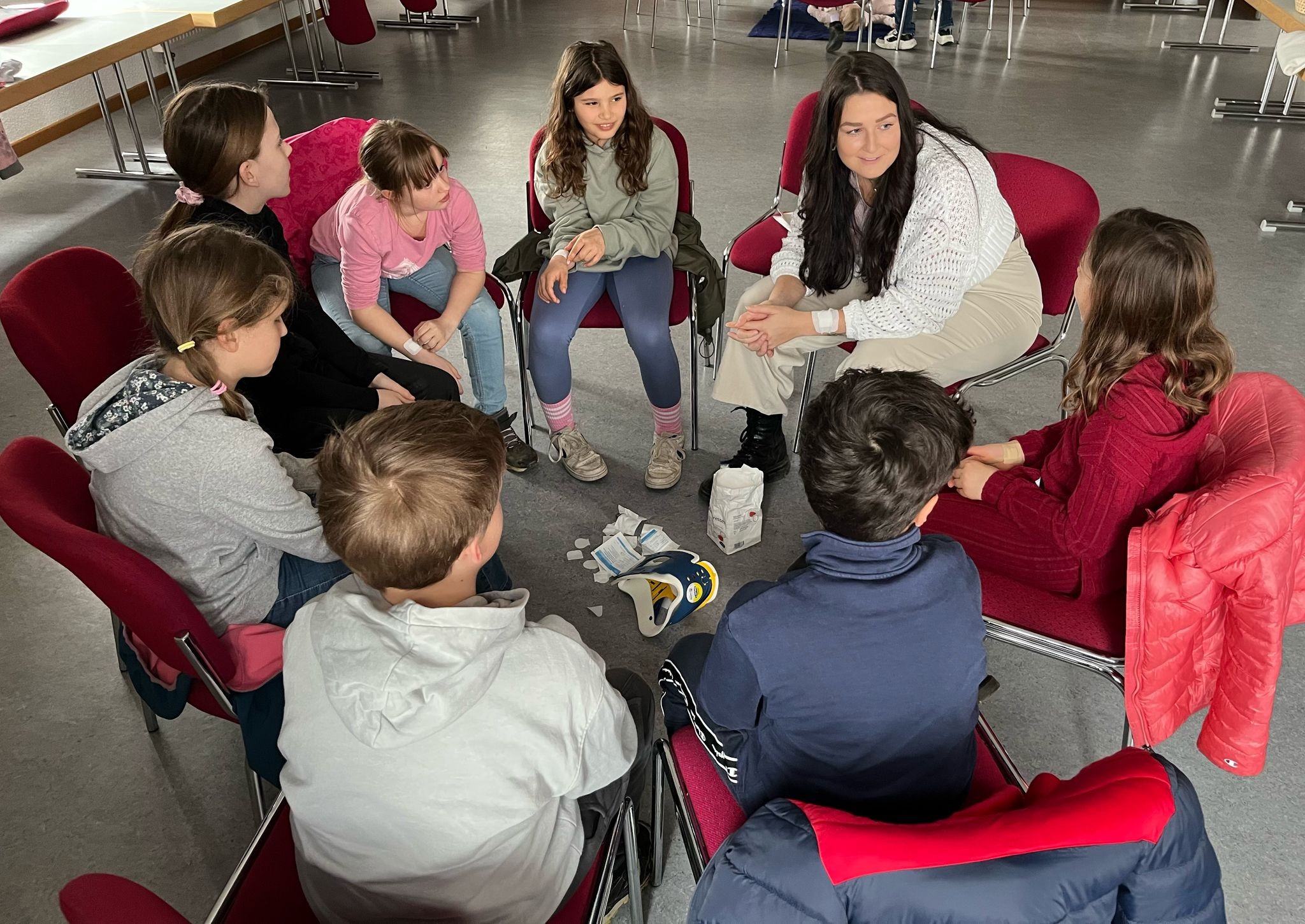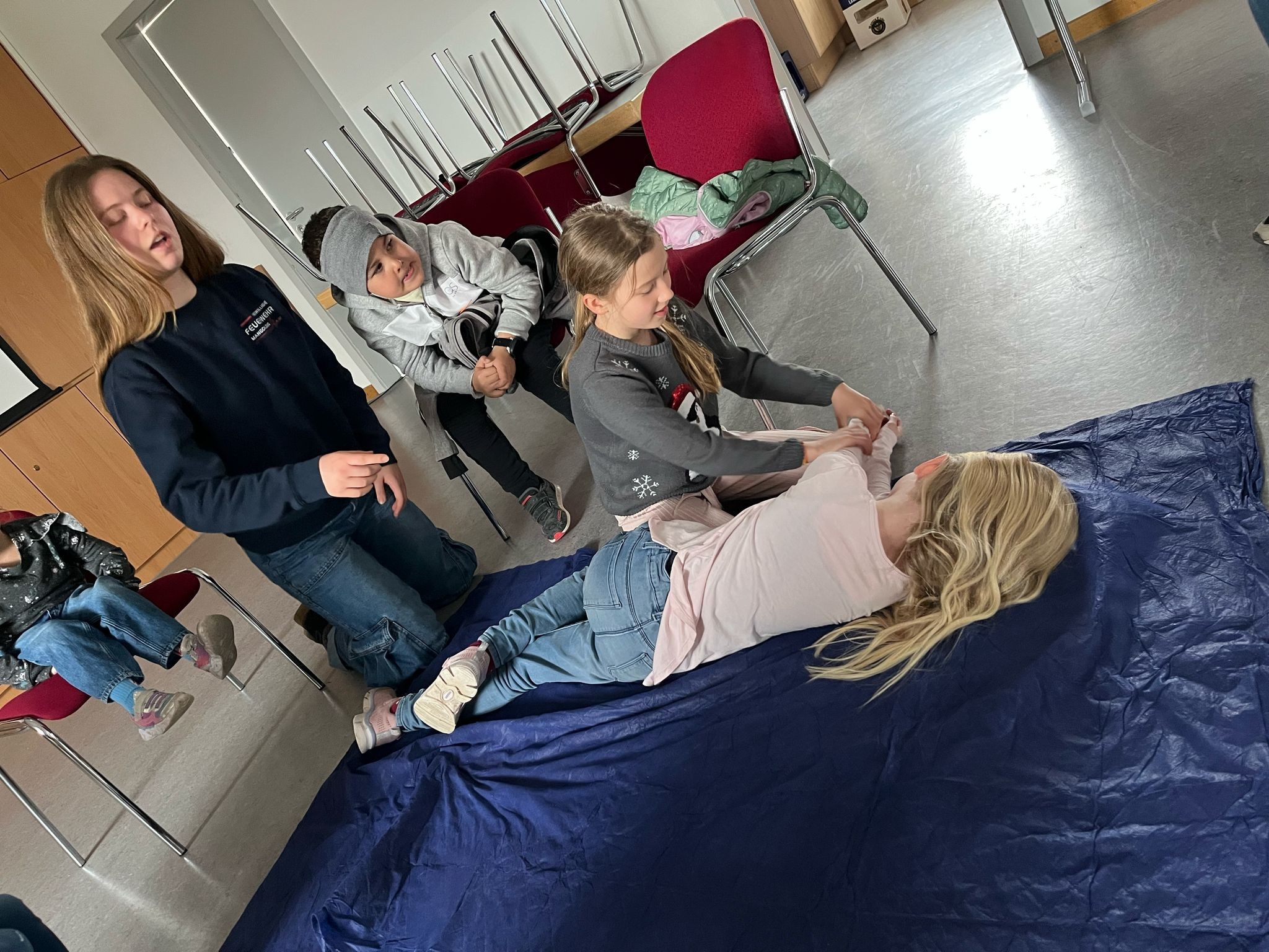 In der zweiten Gruppenstunde spielte das Wetter leider nicht so mit, wie wir geplant hatten, sodass wir sie nach drinnen verlegen mussten. Im Schulungsraum übten wir Erste Hilfe Maßnahmen, wie das Versorgen von Wunden, die Stabile Seitenlage sowie die Wiederbelebung.