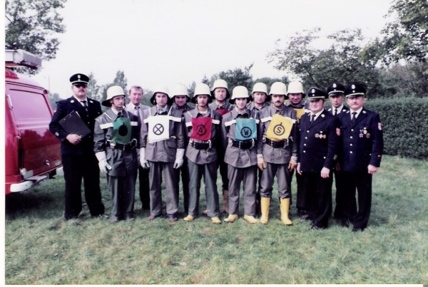 Kommandant Scheck scheute in diesem Jahr keine Mühe, um wieder zwei Löschgruppen auf die Beine zu stellen, die die Prüfung mit Bravour bestanden und so die Abzeichen in Silber, Gold, Gold – Grün oder Gold – Blau erhielten.