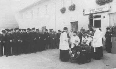 Im Rahmen eines Festaktes wurde uns am 28. Oktober 1984 eine neue Motorspritze TS 8/8 von der Gemeinde übergeben. Nach einem Gedenkgottesdienst in unserer Kirche St. Peter erteilte Pfarrer Peter Gruber der Löschspritze vor unserem neuen Vereinslokal Schropp den kirchlichen Segen. Glückwünsche dazu sprachen auch Bürgermeister Willi Scheck und Kreisbrandrat Heinrich Ettl aus.