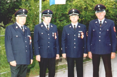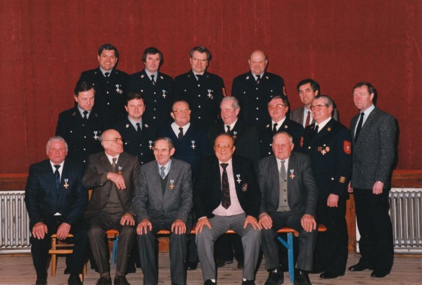 Im März 1988 trafen sich alle Feuerwehrkameraden zu einem Fototermin im Schroppsaal für unsere Festschrift. Abends fanden im Vereinslokal durch Landrat Schmid, Kreisbrandrat Ettl, Kreisbrandmeister Groß und Bürgermeister Scheck Ehrungen für verdiente Mitglieder statt.