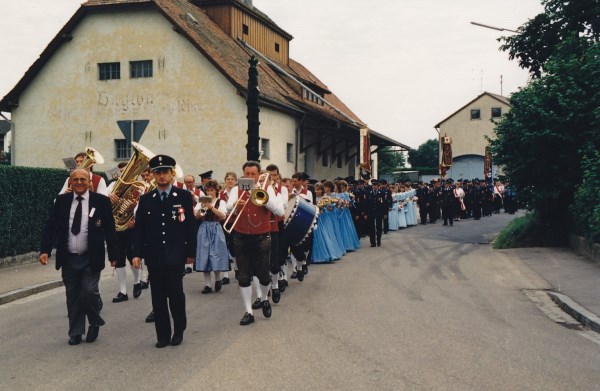 Samstag, 02.07.1988Im Verlauf des Abends überreichte Kommandant Scheck dem Festleiter von 1963 Ferdinand Frummet und dem Kommandanten von 1963 Xaver Bschierl ein kleines Präsent. Die ehemaligen Fahnenmutter, die Festbraut und die Festdamen erhielten einen kleinen Blumenstrauß als Dank und Anerkennung. Bei einem gemütlichen Beisammensein klang der zweite Tag des Festes aus.Sonntag, 03.07.1988Mit dem Weckruf wurde der Festsonntag eingeleitet.