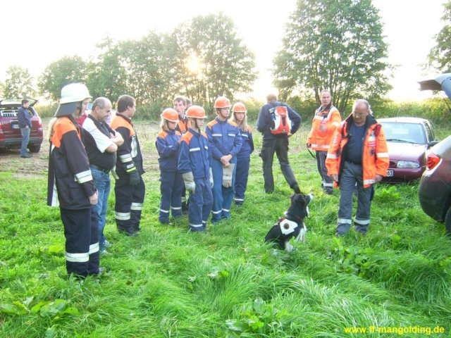 Ein Höhepunkt dabei war sicherlich die Personensuche am frühen Abend, die zusammen mit der Rettungshundestaffel Ostbayern durchgeführt wurde. Dabei wurden wir in kleinen Gruppen jeweils einem Hundeführer mit Helfer zugeteilt. Zielstrebig durchsuchten die Hunde mit ihren Führern und uns das ihnen zugewiesene Gebiet und hatten so die vermissten Personen schnell ausfindig gemacht. Alle zeigten sich von der Leistung der Hunde sehr beeindruckt, denn angesichts der Verstecke der Vermissten hätten wir uns ohne Hilfe der Hunde wohl auf eine lange und schwierige Suche mit fraglichem Ausgang begeben müssen. Nachdem wir uns alle wieder am Gerätehaus versammelt hatten, wurde uns noch die Arbeit eines sogenannten Mantrailers vorgeführt. Dieser Hund folgt mit enormer Geschwindigkeit und Sicherheit der Spur genau der Person, deren Fährte er vorher, z.B. durch ein Kleidungsstück des Vermissten aufgenommen hat. Nach diesen aufregenden und beeindruckenden Vorführungen begaben wir uns zum wohlverdienten Abendessen.