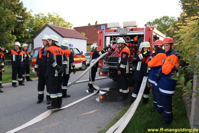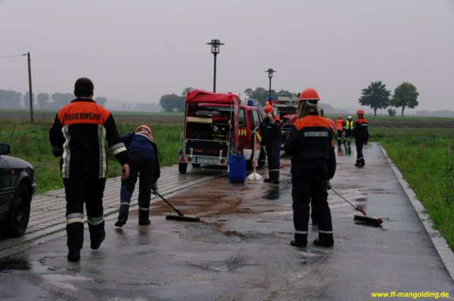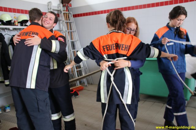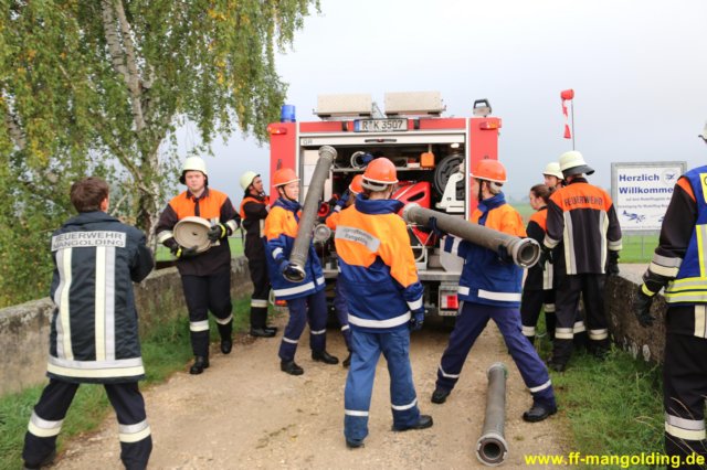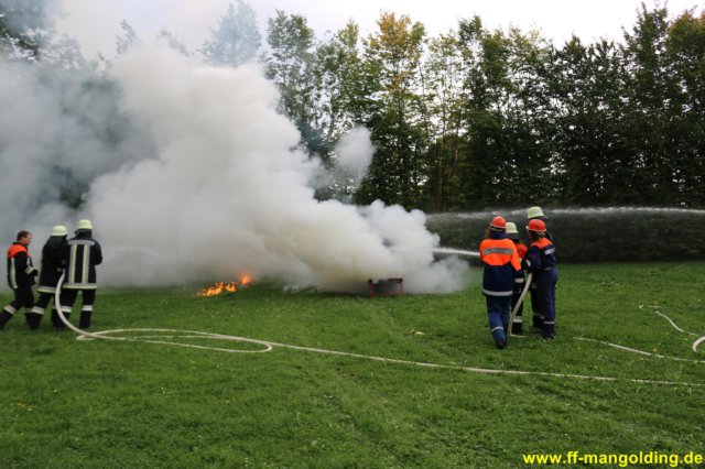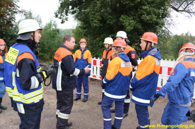 Nach einigen freien Stunden am Nachmittag nahmen wir abends zusammen mit einem Teil der aktiven Feuerwehrmannschaft an der Auftaktübung zur Brandschutzwoche in Sarching teil. Bei dieser Übung wurde der Brand eines Stadels angenommen, in dem fünf vermisste Personen zu bergen waren. Wir waren für die Wasserversorgung der Drehleiter Mintraching zuständig und mussten so eine Schlauchleitung legen und Wasser fördern. Da es für viele die erste Übung mit mehreren Feuerwehren war, war es sehr interessant zu sehen, wie eine solche Zusammenarbeit abläuft. Im Anschluss konnten wir uns noch in gemütlicher Runde stärken, bevor es zurück nach Mangolding ging. Nach Anbruch der Dunkelheit wurden wir erneut alarmiert und mussten auf der Verbindungsstraße nach Scheuer eine Ölspur beseitigen. Besonders wichtig war dabei natürlich auch die Verkehrsabsicherung, um sicherzustellen, dass unsere eigenen Kräfte ungefährdet arbeiten konnten. Den letzten Einsatz dieses Tages stellte schließlich eine Personensuche im Wald dar. Nachdem wir einige Zeit erfolglos gesucht hatten, kam schließlich die Entwarnung: Die vermissten Kinder waren wohlbehalten wieder zu Hause eingetroffen und so konnten auch wir wieder einrücken und die wohlverdiente Nachtruhe konnte beginnen.