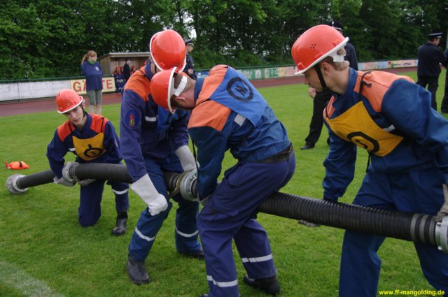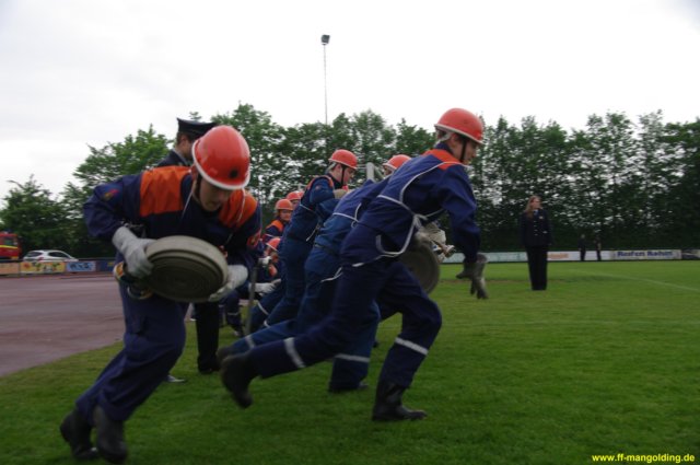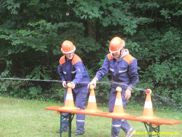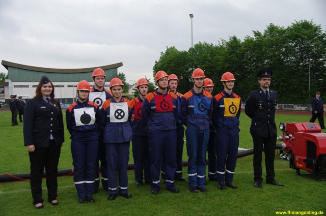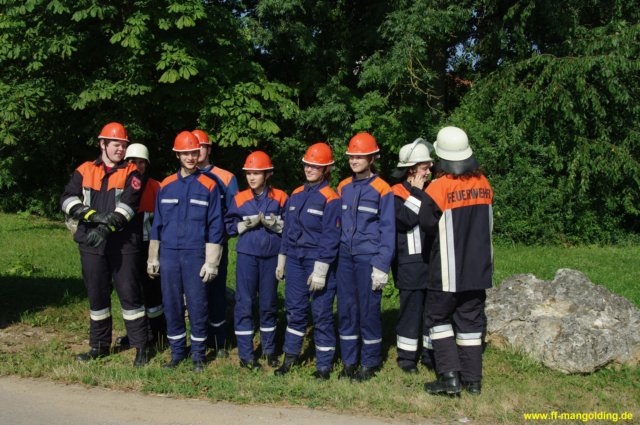 Nach mehreren Wochen fleißigen Übens stand im Mai der Tag der Abnahme in Lappersdorf an. Dabei musste die Gruppe verschiedene Aufgaben bewältigen. Die erste bestand darin, acht C-Schläuche möglichst schnell aneinander zu kuppeln. Im Anschluss wurde das Wissen aller auf die Probe gestellt und es galt einige Fragen zu Feuerwehr und Politik zu beantworten. Nachdem alle in ihre Sportkleidung geschlüpft waren, standen der 1500 m Staffellauf und das Kugelstoßen auf dem Programm. Zuletzt musste ein Löschaufbau mit Saugschlauchkuppeln vorgeführt werden.