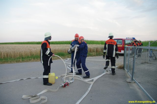 Den Rest des Abends verbrachten wir dann mit Spielen, bis wir zum nächsten Einsatz gerufen wurden. Nun galt es einen Tank mit Schaum zu löschen. Da kein Hydrant vorhanden war, kuppelten wir die Saugschläuche zusammen und nutzten so den Scheuerer Weiher als Wasserreservoir. Während des Einsatzes wurden wir erneut alarmiert, so dass ein Teil unserer Mannschaft zu einer abgelaufenen Brandmeldeanlage nach Mangolding abrückte. Dies erwies sich aber als Fehlalarm.