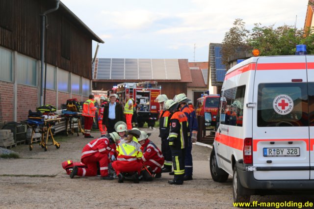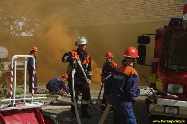Der nächste Einsatzbefehl, den wir bekamen, lautete Großbrand eines landwirtschaftlichen Betriebes in Mangolding. Schnell waren wir an der Einsatzstelle angerückt, wo wir auch die Jugendfeuerwehren aus Mintraching und Köfering antrafen, die uns bei diesem Einsatz unterstützten.